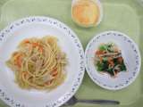 春キャベツとツナのスパゲティ 牛乳 小松菜のサラダ チーズケーキ 春の香りを感...