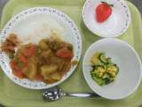 カレーライス コーヒー牛乳 福神漬 フレンチサラダ いちご 6年生を各クラスに...
