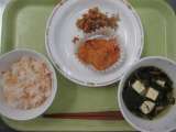 あけぼのごはん 牛乳 松風焼き 大豆とじゃこの甘辛揚げ わかめスープ <主な...