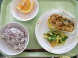ゆかりごはん さかなのマヨネーズ焼き アスパラガスのサラダ サンフルーツ ...