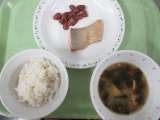 むぎごはん さけの照り焼き うずらまめのにまめ みそしる 牛乳 (主...