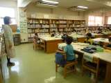 図書室での授業です。図書室の先生から本の貸し借り、使い方の説明を受けています。
