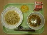 <献立> みそラーメンつけめん、フルーツポンチ、牛乳 <主な食材と産地> にん...