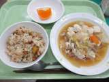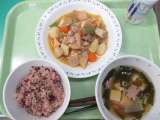 お赤飯・春野菜のうま煮・すましじる・乳酸飲料 今日は、進級お祝い給食です...
