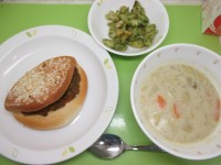 焼きカレーパン・牛乳・きゃべつと豆乳のスープ・青のりポテトビーンズ
