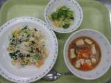 青菜のチャーハン 牛乳 中華サラダ 麻婆汁 青梗菜・ハム・卵でチャーハンを作り...