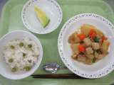 チキンカレーライス 牛乳 福神漬け こんにゃくサラダ 運動会前で疲れた子供たち...