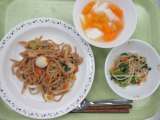 五目焼きそば 牛乳 ナムル 杏仁豆腐 豚肉・えび・いか・うずら卵と野菜の入った...
