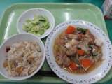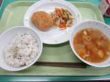 ごまごはん・肉じゃがコロッケ・ボイルキャベツ・けんちん汁・牛乳 主な食材...