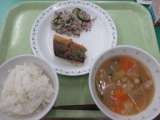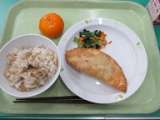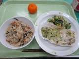 五目ごはん・さけのマヨネーズ焼き・いそあえ・冷凍みかん・牛乳 主な食材と産...