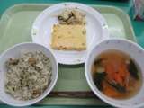 まめごはん・千草焼き・きゃべつのしおこんぶかけ・五目汁・牛乳 主な食材と産...