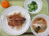 いわしのかば焼き丼 牛乳 きゅうりのひと塩 冬瓜の味噌汁 冷凍みかん カリカリ...