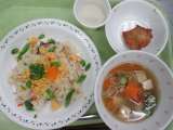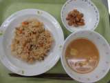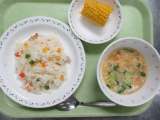 ピラフ 牛乳 チーズと卵のスープ 蒸しとうもろこし 一年生がとうもろこしの皮む...