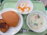 セルフフィッシュサンド・キャベツと豆乳のスープ・杏仁豆腐・牛乳 今日で1学...