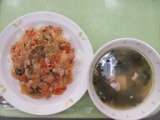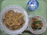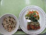 ひじきごはん・ちくわの二色あげ(いそべあげ、お好みあげ)・こまつなのおかかあ...