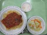 スパゲティミートソース・キャベツサラダ・ミルクゼリー・牛乳 (主な食材の産...