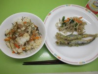 豚肉とごぼうのごはん・牛乳・ししゃもの磯部あげ・油揚げと野菜のおひたし