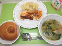 胚芽パン・牛乳・魚のピザ(鮭)・ジャーマンポテト・キャベツのスープ