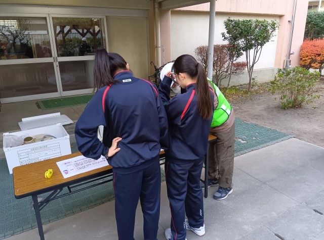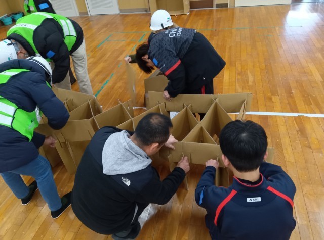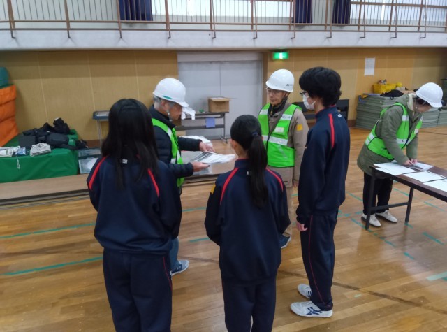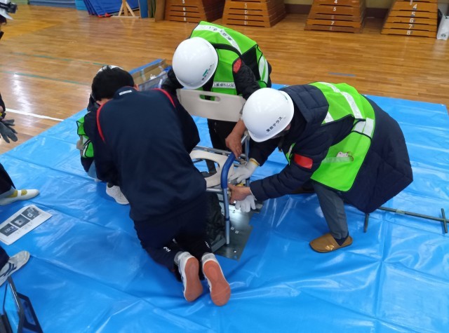 テントや段ボールベッドを組み立てるグループ、受付を作るグループ、簡易トイレを作るグループ、炊き出しの場所を準備するグループに分かれてそれぞれ作りました。