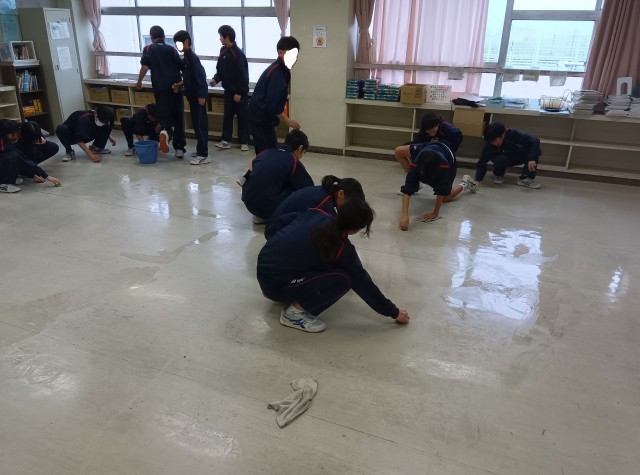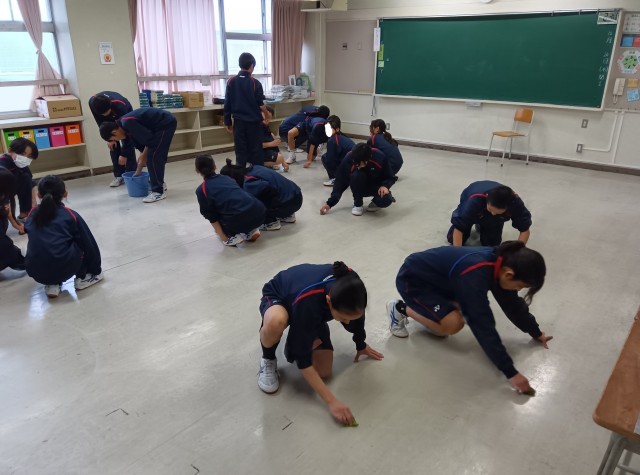 どのクラスも机を出して、床を雑巾掛けします