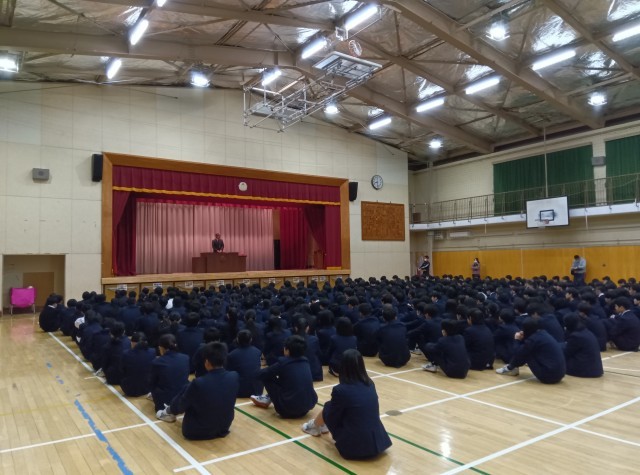 全校朝会では、最近集まりが遅いということで生徒会からの発案で、早めに集まりクラスごとに列んで体育館に行く。ということをしています。その点について早めの集合ができるようになりましたね。と校長先生から褒めていただきました。