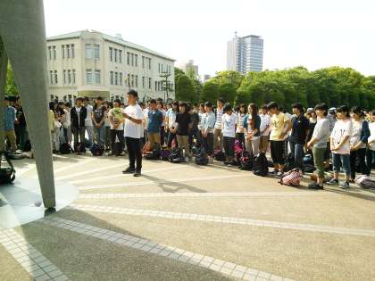修学旅行2日めが始まりました。朝8時30分、平和記念公園にて平和セレモニーを行い千羽鶴を献上しました。写真は、平和宣言の様子です。