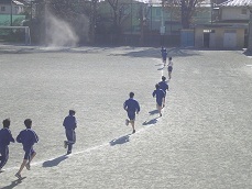校庭では強い風の中を、生徒たちが元気に走っています。