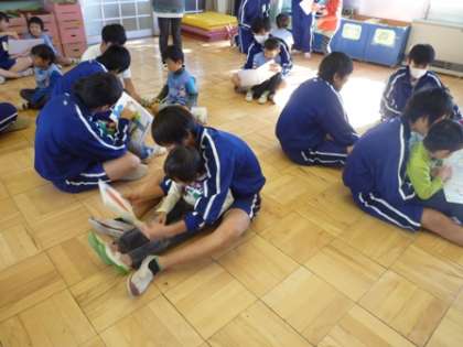 はじめの会の後は、絵本の読み聞かせタイムです。家庭科の授業で作成した手作りの絵本を、園児に読み聞かせをします。生徒の膝にちょこんと座って読み聞かせをしてもらっている園児の姿は、なんとも微笑ましい光景でした。