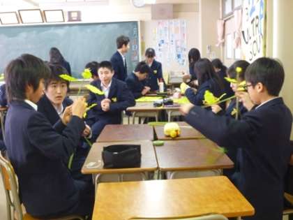 昨年度、生徒会主催で始まった「菜の花プロジェクト」。今年度も、1・2年生の学級委員が準備を進め、各クラスで学級委員を中心に協力しながら菜の花を作成しています。この菜の花は、在校生から3年生へのプレゼントです!3月20日の卒業式に、1・2年生手づくりの菜の花が飾られます。
