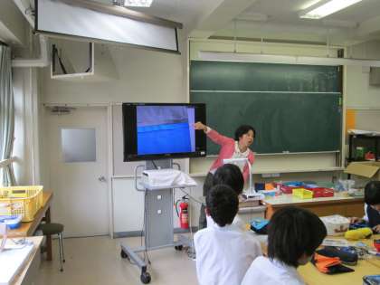 お弁当を入れるトートバッグを制作しています。実物投影機を通して、作業の仕方がわかりやすく示されています。お互いに協力しながら、慣れないミシンを何とか使っていました。