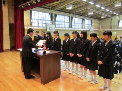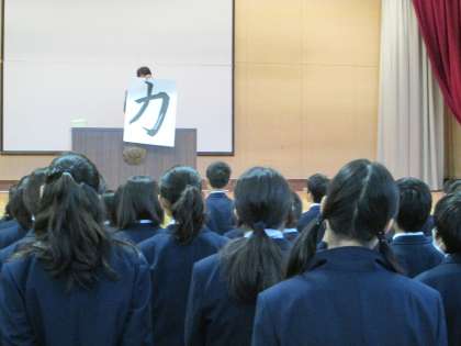 校長先生から「力」の文字が示され、「継続は力なり」とのお話がありました。その後、ラグビー部、バトミントン部、2年生美術科、英語スピーチコンテストの表彰を行い、スピーチコンテスト入賞者からすばらしいスピーチの披露がありました。