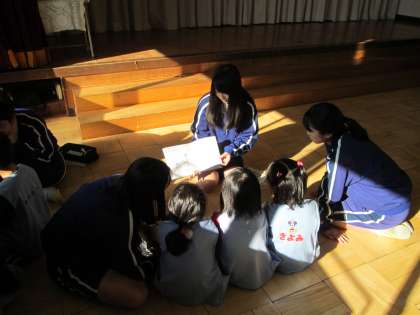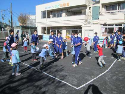 家庭科の授業として3日間に渡って続いた保育実習も最終日となりました。クラスごとに塚戸幼稚園を訪問して、園児との交流を持ちました。授業の中で制作した絵本を読み聞かせたり、園庭で一緒に遊んだりと、直接幼稚園児とふれあう貴重な機会となりました。
