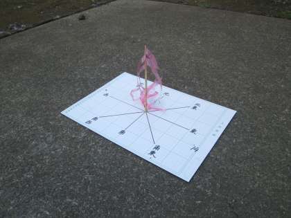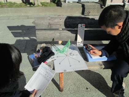 手作りの風力計を使って校地内で気象観察を行っています。雲一つない晴天は本来とてもありがたいものですが、雲の動きや風力を観るにはあいにくの天候です。自然にはかなわないことを実感することになりました。
