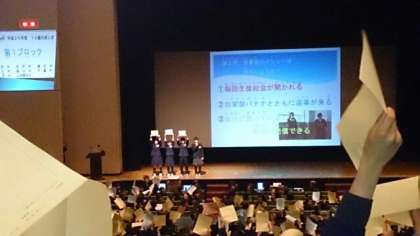 世田谷区民会館で第9回となる14歳の成人式が行われました。今年のテーマは「人間関係をよりよくするために」です。第1ブロックの発表では、千歳中生徒会の意見箱の取り組みが紹介されました。