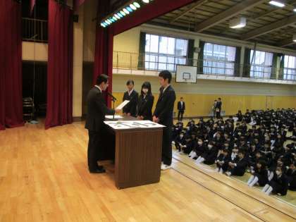 本日は「学」についてのお話です。学ぶ意味や学び方について考えることができたと思います。校長先生のお話の後、区大会で優勝したテニス部の表彰が行われました。寒い中でしたが、時間通りに進めることができました。