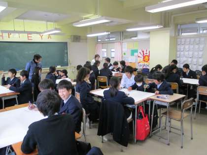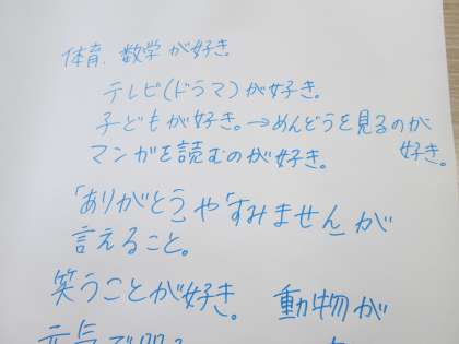 ワークショップの3回目は「大切な自分」がテーマです。自分の良いところをそれぞれ模造紙に書き出して、班のメンバーで共有しています。