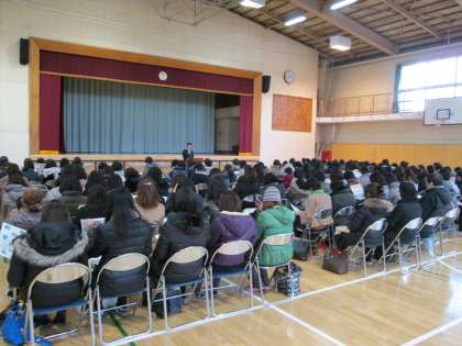 寒い中お集まりいただきありがとうございました。なお、出席できなかった入学予定保護者の方には、当日の配布資料をお渡しできます。千歳中副校長までご連絡ください。