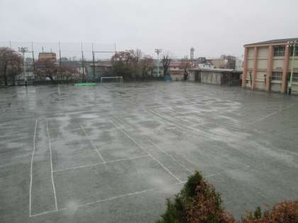 本日は悪天候のため、校庭を使用できません。3年生は、1時間遅れの9時30分登校となります。ただし、係生徒は仕事がありますので、ハンドボール投げの担当になっている生徒以外は、通常通り8時30分に登校してください。