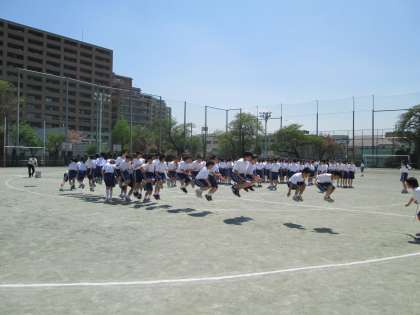 初めての学年練習は、大縄飛びに悪戦苦闘中です。みんなの心を一つにして、繰り返し飛べるようになるまで練習あるのみです。声を掛け合い、とても元気よく取り組んでいます。