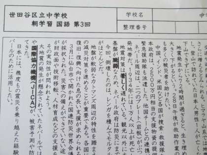 今年度より2年生では、週に1回新聞社説を活用した朝学習に取り組んでいます。ことばの力を高める学習活動として、世田谷区内全校で実施します。少し難しい内容かもしれませんが、チャレンジしていきましょう。