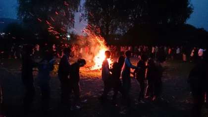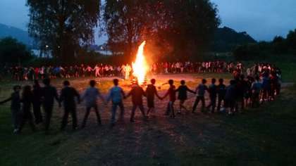 キャンプファイヤーはフォークダンスで盛り上がっています。
