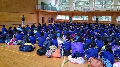 閉園式を終えて、9時40分に林間学園を出発しました。残念ながら富士山五号目は断念して、富士湧水の里水族館に向かいます。
