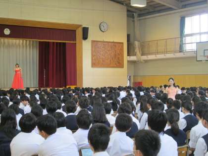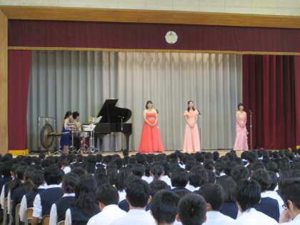 昨年に引き続き、フェスティーナレンテの皆さんをお招きして音楽鑑賞教室を開催しました。全11曲に渡りすてきな歌声を披露していただき、聴衆と一体となった和やかなステージとなりました。合唱コンクールを前にとても良い時間を過ごすことができました。