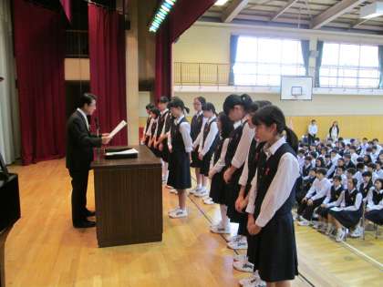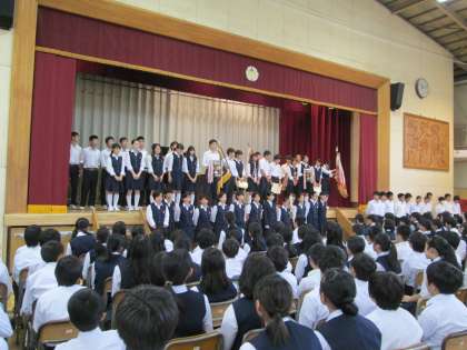 見事2連覇を達成した陸上大会と、新人大会で活躍したバドミントン部の表彰です。優勝旗が3本並ぶと壮観です。バドミントン部は区大会団体戦3位に入賞し、これからブロック大会に臨みます。