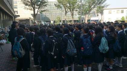 学芸発表会当日となりました。1年生が予定通りの時間に集合完了しました。これから最後の声だしです。