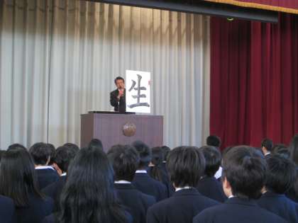 本日の一文字は「生」です。前向きに生きていくために、日常友達同士で交わし合う「ことば」のことを考えてほしいという校長先生のお話でした。人に発したことばは自分が言われた時にどう感じるか、よくことばを選んでほしいと思います。そして、つらいことがあれば一人で抱え込まず誰かに話してください。いじめのない、皆が前向きに生きていける環境を進んで作っていきましょう。