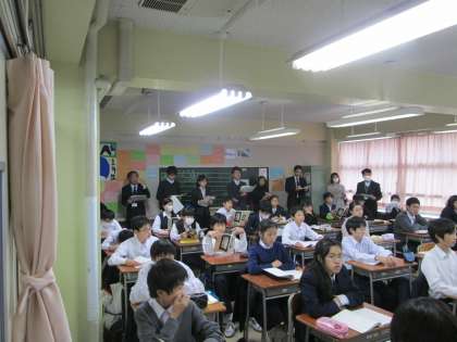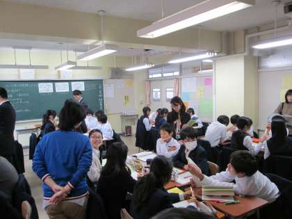 世田谷区内の先生方が集まり、教科「日本語」の研修会が行われました。1年生の哲学領域で、「ルール作り」について考える授業でした。多くの参観者がいる中でしたが、活発な意見交換をしながらルールの必要性について考えていました。