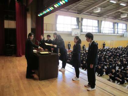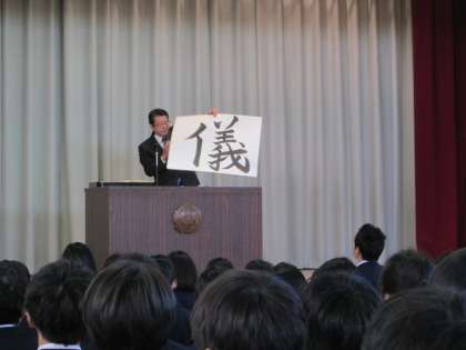本日の一文字は礼儀の「儀」です。「親しき仲にも礼儀あり」というように、礼儀は、相手を尊重して認めるあかしとして、普段の生活の中でも大切にしていきたいですね。その後、3年生の税の作文・標語入賞者と書道部入選者の表彰を行いました。おめでとうございます。