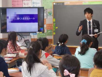 本校社会科教員が塚戸小学校6年生に出前授業を行いました。中学校では3年生で学習する「働く人を守るルール」という内容の授業です。小学生では学習しない内容なので、とても興味深く授業に取り組んでいました。