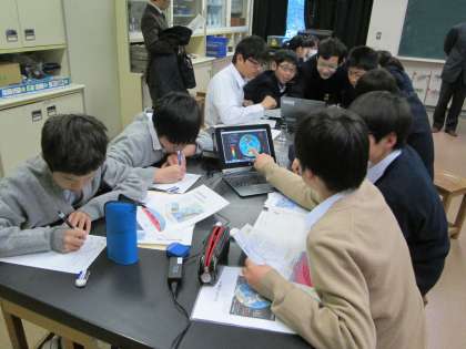 「火山と地震はどのような場所に多いか」について、原因を基に説明できるようにするに、グループ学習に取り組んでいます。様々な資料から必要な情報を的確に取り出す力が求められます。話し合いがとても意欲的に行われていました。